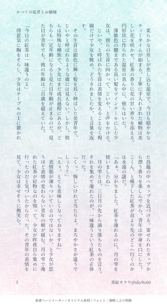 人外の主従関係の二人で、お嬢様と生首元執事な話。美しい執事の髪は長いので、お嬢様が持ち歩ける背の高い鳥籠に入れられています。という、すごい自分の好み全振りした話だったな!